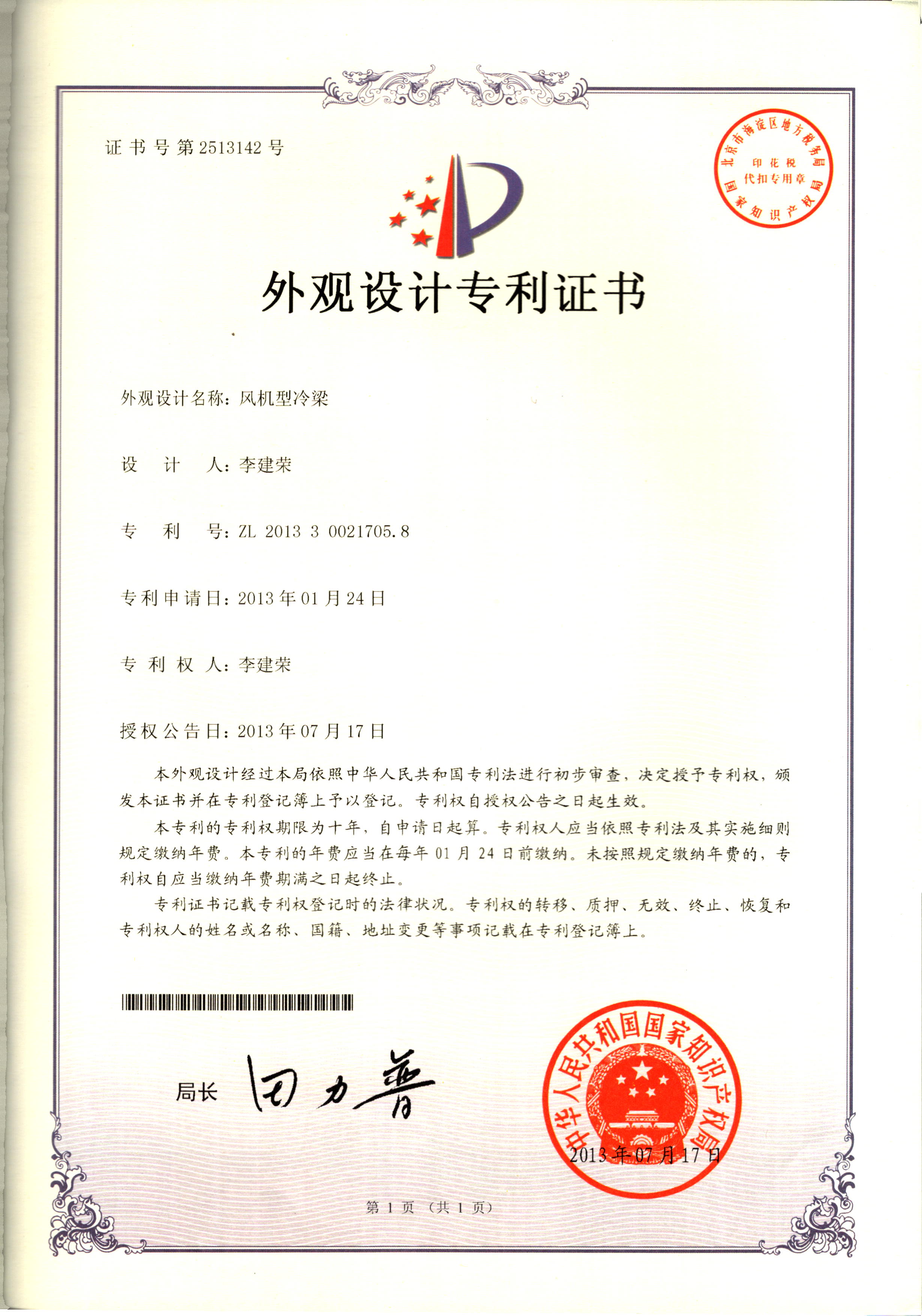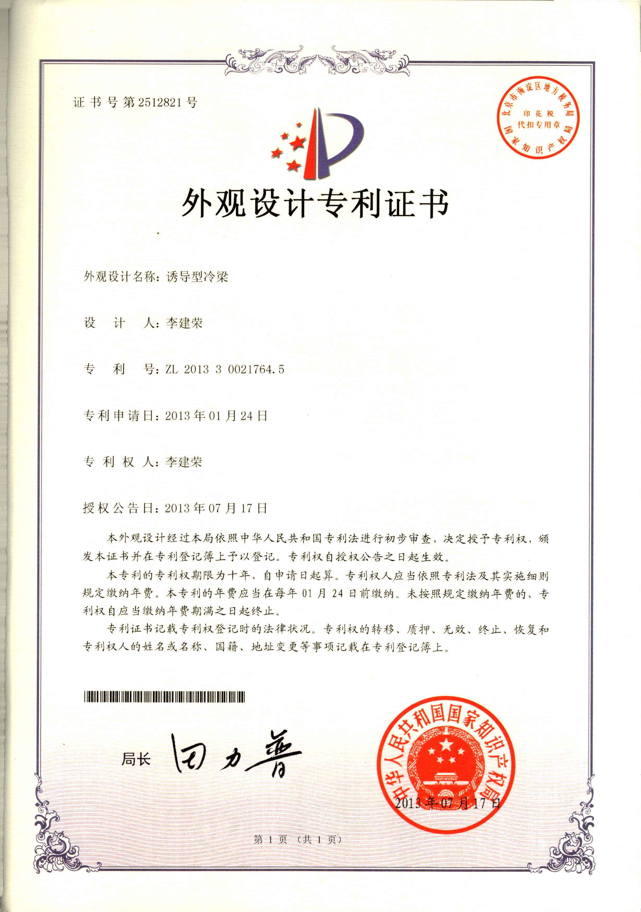 外觀設計專利證書--誘導性冷梁