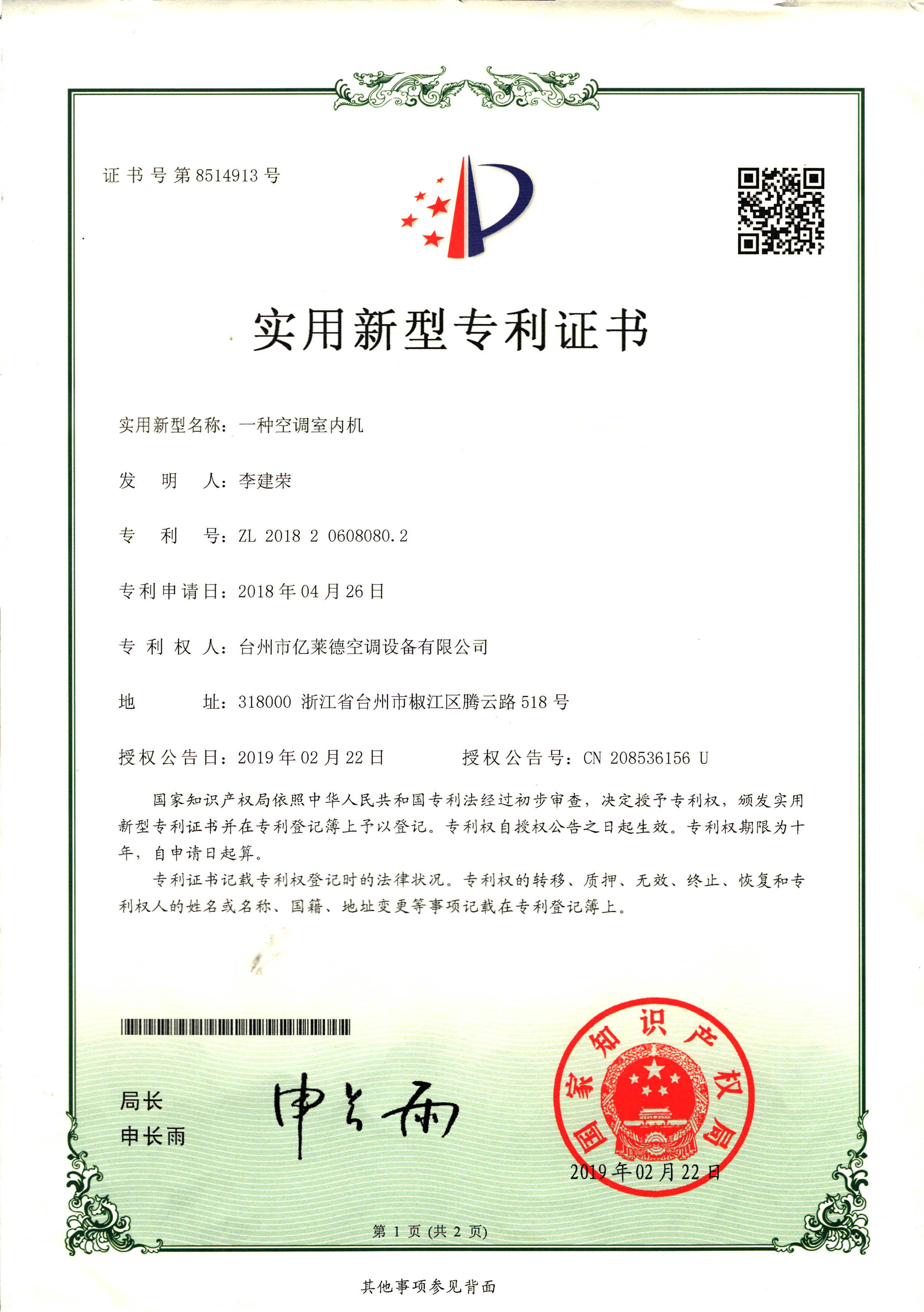實用新型專利證書--一種空調(diào)室內(nèi)...