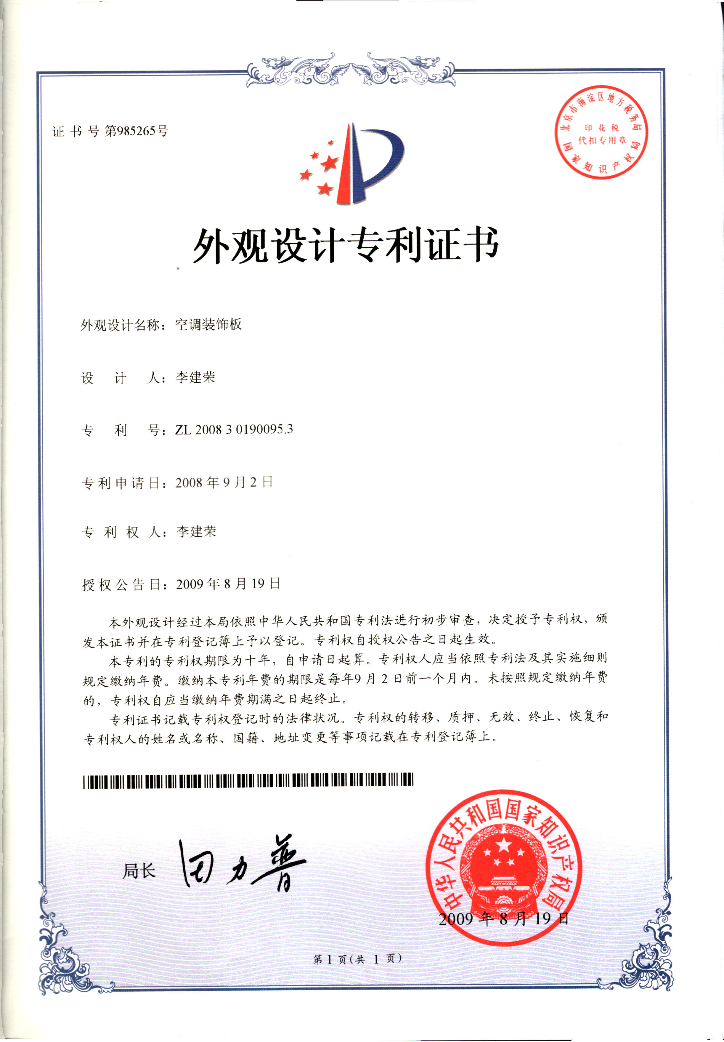外觀設計專利證書--空調(diào)裝飾板