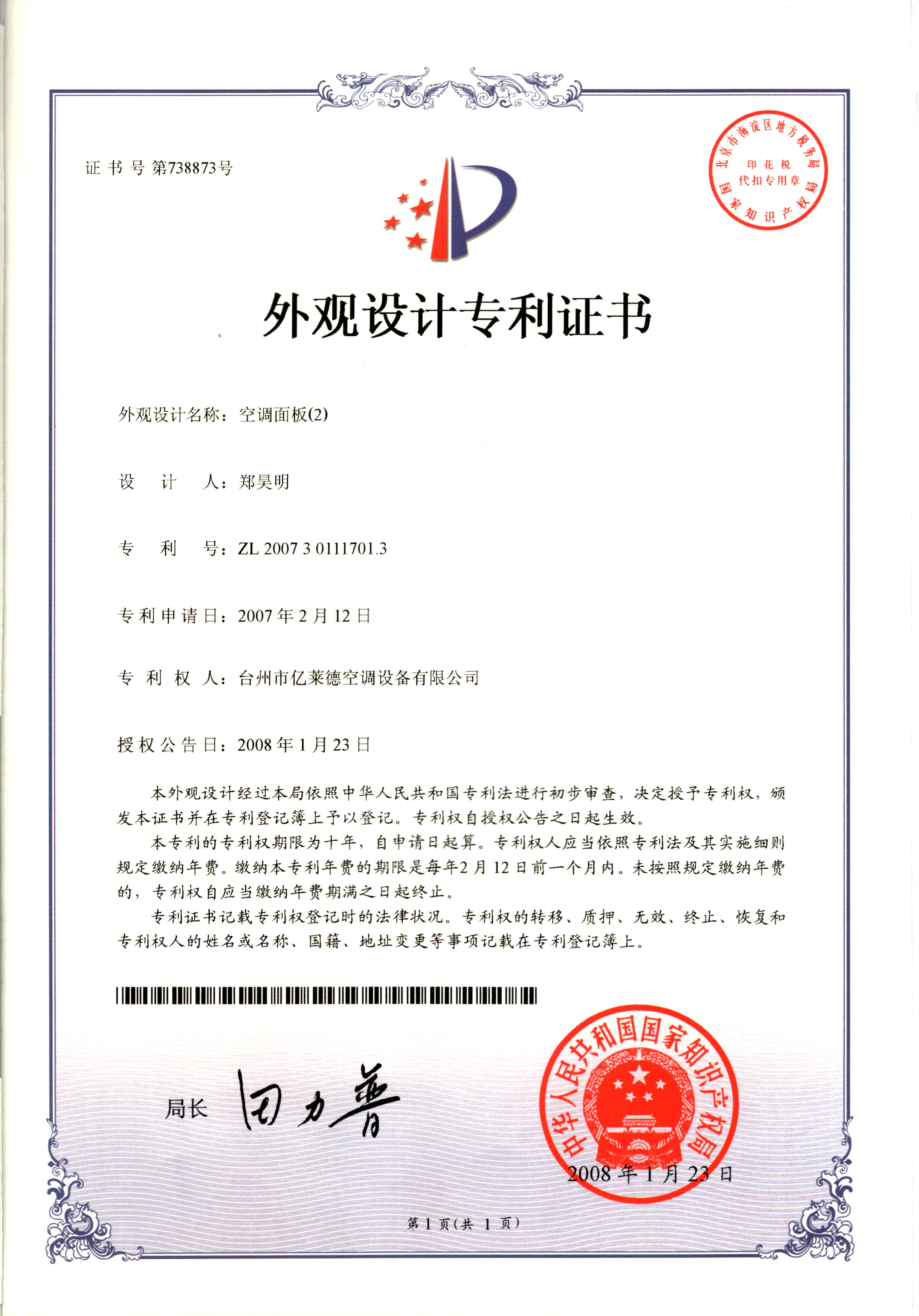 外觀設計專利證書--空調(diào)面板(2)