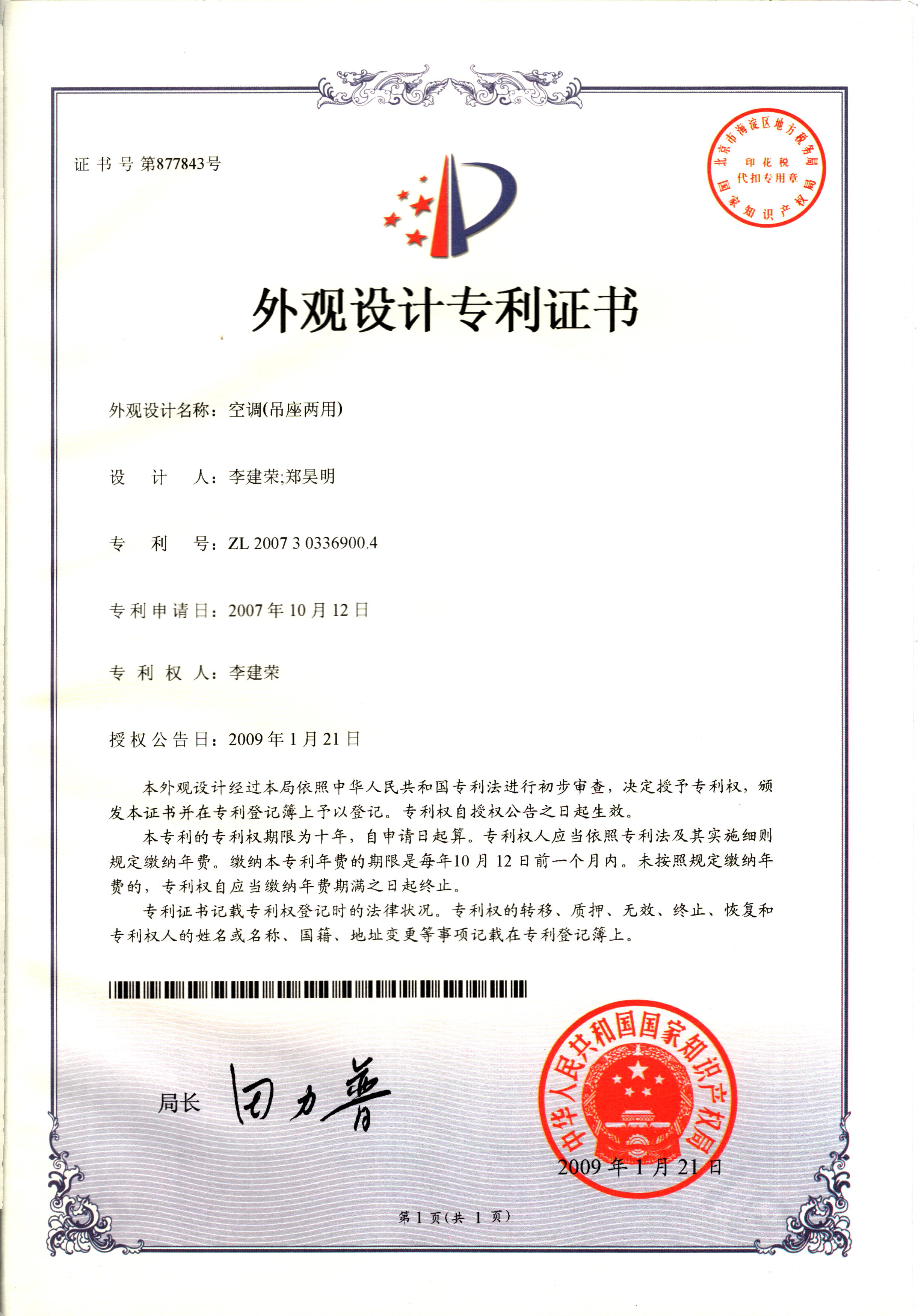 外觀設計專利證書--空調(diào)(吊座兩用...